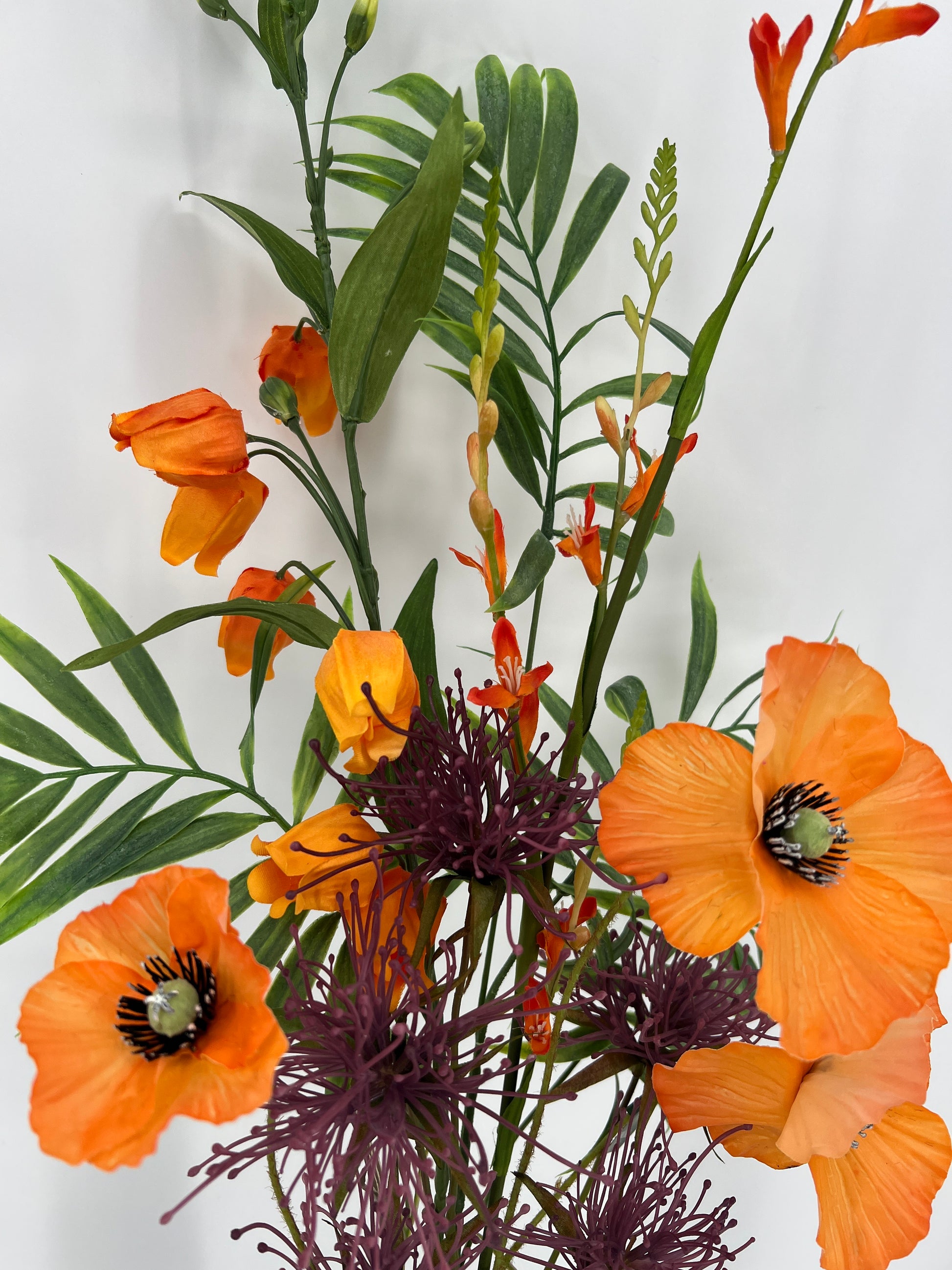 De oranje klaproos van Silk-ka vormt het zonnige middelpunt, omringd door een elegante Sandersonia spray en een vurige Montbretia spray van Emerald, de Hakea en het bladgroen zorgen ze samen voor een krachtige lentesfeer – zonder water, zonder zorgen.